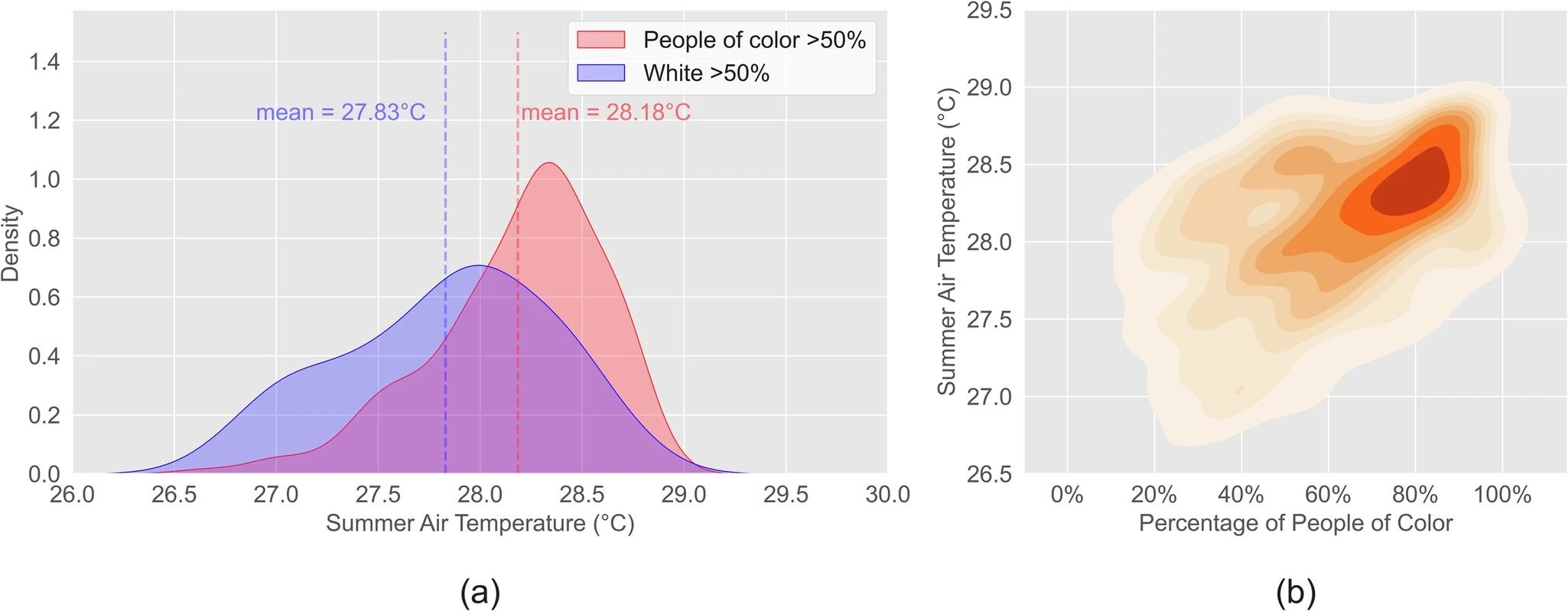 Their analysis found that lower-income communities of color experienced consistently higher average temperatures, more days of extreme heat, and more significant increases in heat exposure over a thirty-year period. They also found that these neighborhoods have less adaptation infrastructure, such as fewer shade trees and significantly lower air-conditioning ownership rates than in predominantly white neighborhoods. This results in a double burden of higher heat and fewer resources to mitigate it, leaving residents in these communities especially vulnerable to heat-related health and economic risks.